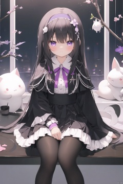 chen_bin,1girl, akemi homura, sitting, long hair, pantyhose, black hair, purple eyes, hairband, kyubey, long sleeves, skirt, looking at viewer, argyle legwear, bangs, capelet, black pantyhose, frills, closed mouth, feet out of frame, black hairband, frilled skirt, ribbon, magical girl, :3, shirt, argyle, creature, knees together feet apart, neck ribbon, expressionless, on lap, white shirt, solo