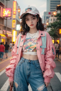 ((Masterpiece)), ((Best Quality)),80sDBA style, Super High Resolution, 1 Girl, Dreampolis, hyper-detailed digital illustration, cyberpunk, single girl with techsuite hoodie and headphones in the street, neon lights, lighting bar, city, cyberpunk city, film still, hat,