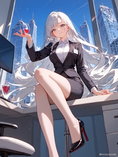 (score_9_up,score_8_up),Woman wearing business outfit, formal blazer, white blouse, heels, black high waist business skirt, beautiful, masterpiece, best quality, extremely detailed face, perfect lighting, nice hands, perfect hands, (white hair:1.2), long hair, (grey eyes:1.2), slender build, long legs, thin, medium breasts, business woman, ceo, sitting in luxurious black leather office chair, glass wall with view of nighttime city skyline in background