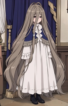 1girl, very long hair,wavy hair, hair between eyes,hair tubes,capelet,frills,long dress,white dress,white bow,white bowtie,ribbon, long sleeves, long skirt, boots,black footwear,