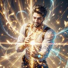 <lora:HolyMagic:0.9>, holymagic , fantasy, divine aura,  magical energy,  wizard, man, <lora:Gigachadv1:0.6> gigachad, glowing hair ,upper body, hands holding energy , closeup, light smile , glowing eye