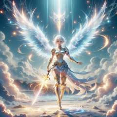 <lora:HolyMagic:0.8>, holymagic , fantasy, divine aura,  magical energy, 1girl, glowing hair, glowing eyes, fantasy, dissolving, wrath, full body, female, (knight:1.1) , enchanted armor , enchanted sword , greatsword,