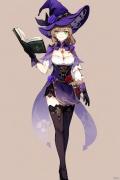 masterpiece,best quality,1girl, solo, long hair, breasts, smile, simple background, brown hair, hair ornament, thighhighs, gloves, hat, dress, cleavage, green eyes, full body, flower, black gloves, black thighhighs, high heels, book, witch hat, rose, open book, purple flower, witch, purple headwear, lisa \(genshin impact\)