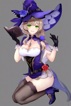 masterpiece,best quality,1girl, solo, long hair, breasts, smile, simple background, brown hair, hair ornament, thighhighs, gloves, hat, dress, cleavage, green eyes, full body, flower, black gloves, black thighhighs, high heels, book, witch hat, rose, open book, purple flower, witch, purple headwear, lisa \(genshin impact\)