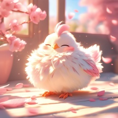 youji,chicken,fluffy,sunlight,light particles,^ ^,whiskers,cute,cc-color-correction,mf-movie-filter,warm colors,whimsy and dramatic lighting,white fur,soft lighting,chicken focus,no humans,closed eyes,cherry blossoms,bird,pokemon \(creature\),petals,blurry,blurry background,feathers,standing,full body,outdoors,depth of field,indoors,blush,day,cat,<lora:youji_xl:0.8>,