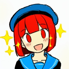 1girl, solo, :d, collarbone, blue hat, straight hair, sailor collar, white background, short hair, hair between eyes, tareme, hat, blue sailor collar, red eyes, open mouth, smile, close-up, beret, blush, eyelashes, portrait, simple background, light blush, looking at viewer, white hat, red hair, head tilt, sparkle, bob cut, inverted bob, happy, character name, masterpiece, best quality, safe