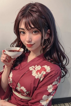 (masterpiece, best quality,top quality),1girl,solo,realistic,cup,long hair,smile,closed mouth,wavy hair,red wine cup,holding cup in right hand,lips,upper body,yukata,japanese clothes,indoos,restaurant,rlooking at viewer,simple background,sake,front view,<lora:aika_yamagishi-v05:0.8>,aika yamagishi,<lora:neg4all_bdsqlsz_V3.5:0.8>,
