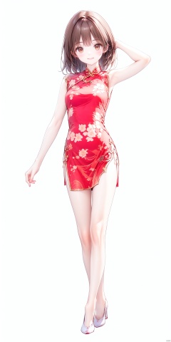 1girl,1girl, solo, smile, bangs, brown hair,China dress, brown eyes, standing, full body, no_sleeves, arm up, high heels, chinese clothes, floral print, Pink Cheongsam,White background,Sleeveless——Clear hand contour,Hand intact,Five fingers of the hand are clear—(Dynamic Posture:1.5), 1girl<lora:EMS-355394-EMS:0.800000>, <lora:EMS-151900-EMS:0.600000>, <lora:EMS-93-EMS:0.800000>, <lora:EMS-27162-EMS:0.300000>, <lora:EMS-254762-EMS:0.400000>, <lora:EMS-69165-EMS:0.300000>