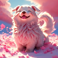xugou,dog,fluffy,sunlight,light particles,^ ^,whiskers,cute,cc-color-correction,mf-movie-filter,warm colors,whimsy and dramatic lighting,white fur,soft lighting,dog focus,no humans,petals,closed eyes,solo,day,outdoors,open mouth,fangs,sky,smile,happy,fang,blue sky,full body,cloud,blush,blurry,tongue,simple background,sitting,<lora:xugou_v1:0.8>,