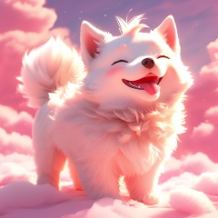 xugou,dog,fluffy,light particles,^ ^,whiskers,cute,warm colors,whimsy and dramatic lighting,white fur,soft lighting,dog focus,no humans,blush,closed eyes,cloud,tongue out,tongue,solo,outdoors,sky,open mouth,fangs,smile,full body,red theme,cloudy sky,teeth,pink theme,<lora:xugou_xl:0.8>,