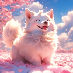 xugou, dog, fluffy, light particles, ^ ^, whiskers, cute, warm colors, whimsy and dramatic lighting, white fur, soft lighting, dog focus, no humans, petals, closed eyes, solo, day, outdoors, open mouth, fangs, sky, smile, happy, fang, blue sky, full body, cloud, blush, blurry, tongue, simple background, sitting,<lora:xugou_xl:0.8>,