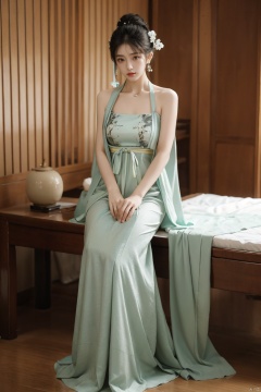 1girl, solo, long hair, breasts, black hair,Hairpins,necklace, hair ornament, dress, cleavage, full body, flower, earrings, indoors, hair bun, white dress, pillow, bed, night, chinese clothes, table, branch,daxiushan, ,daxiushan style,realistic,hanfu, daxiushan,Shoulders are exposed, , daxiushan, arien_hanfu