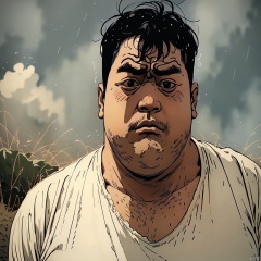 mj, 1boy, male focus, solo, shirt, black hair, looking at viewer, white shirt, outdoors, short hair, frown, upper body, rain, grass, closed mouth, messy hair, thick eyebrows, fat