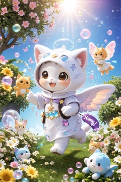 "Chibi" mascots include a cute kitten in a full mascot costume,a mascot in a "Hello" little angel mascot costume,and a mascot catching butterflies in the garden with a cute hood on his head. Kitten wearing winged cherub mascot costume. Naughty and happy smile with many small bubbles floating around,independent lighting,3D style