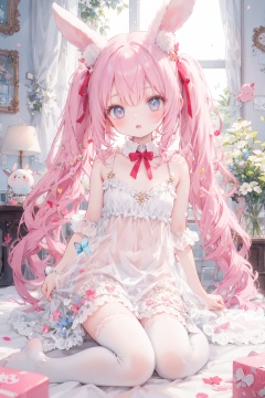 lolita dress, white dress, twintails, rabbit ears, pink hair, frills, white thighhighs, see-through,