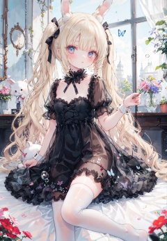 lolita dress, black dress, twintails, rabbit ears, blonde hair, frills, white thighhighs, see-through,
