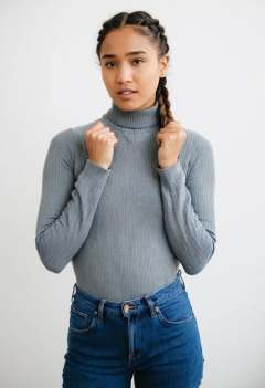 woman, confused expression, questioning gesture, braided hair, grey turtleneck, blue jeans, mixed ethnicity, portrait, high resolution, white background, indoor, natural lighting, facing camera, genuine emotion, casual wear, hands outstretched, no makeup, young *****, neutral color palette, minimalistic style.