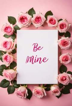 lightbox sign, "BE MINE" text, heart symbol, pink roses, pink background, Valentine's Day concept, romantic gesture, floral, vertical composition, high-resolution image, vibrant colors, love message, decorative setup, soft lighting, top view, emotional sentiment, clear typography, modern romance, still life,