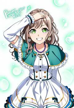 1girl, imai lisa, bang dream!, long sleeves, cassette tape, german text, shirt, simple background, hand up, grin, arm on own head, jewelry, white background, necklace, green eyes, long hair, grey hair, frilled wrist cuffs, beads, hair ornament, cowboy shot, capelet, white skirt, earrings, green capelet, skirt, white shirt, arm at side, frills, looking at viewer, bead necklace, solo, frilled capelet, smile, open clothes, arms up, buttons, parted hair, flower earrings, masterpiece, best quality, absurdres, safe