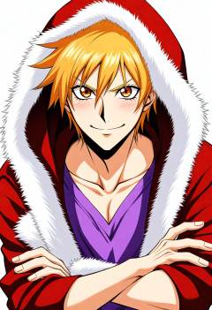 1boy, male focus, kurosaki kazui, bleach,  one-hour drawing challenge, long sleeves, open clothes, fur trim, blonde hair, coat, looking at viewer, spiked hair, solo, light blush, hooded jacket, purple tunic, military jacket, collarbone, upper body, open jacket, hair between eyes, crossed arms, white background, closed mouth, tunic, smile, fur-trimmed coat, orange eyes, red hood, jacket, hood, v-shaped eyebrows, red coat, aged up, masterpiece, best quality, absurdres, safe