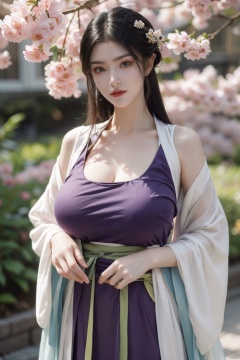 1girl,(spring,flowers:1.2),looking_at_viewer,hanfu,(big breasts:1.59),purple dress