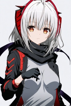 1girl, solo, w \(arknights\), horns, grey shirt, jacket, looking at viewer, simple background, white background, black jacket, shirt, upper body, scarf, open clothes, open jacket, breasts, short hair, red eyes, black scarf, grey hair, ahoge, medium breasts, demon horns, sketch, black gloves, white hair, orange eyes, bangs, closed mouth, gloves