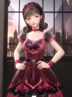 SYNNliexinzhiling, 1girl, solo, brown hair, dress,hairband, pantyhose, brown eyes, choker,short hair,wrist cuffs,boots, <lora:SYNNliexinzhiling:0.75>,cityscape,night,indoors, window,  hand on hip, see-through, looking at viewer, curly hair,