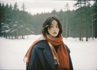 a woman standing in the snow with a scarf,album cover,forest in background,atmospheric and depressed,film,longcoat,best shot, reality,analog film photo,faded film,desaturated,35mm photo,grainy,vignette,vintage,Kodachrome,Lomography,stained,highly, realistic