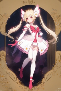 1girl, solo, long hair, looking at viewer, bangs, blonde hair, hair ornament, red eyes, thighhighs, dress, bow, twintails, jewelry, very long hair, closed mouth, underwear, standing, collarbone, panties, full body, flower, earrings, detached sleeves, wings, choker, hair flower, white dress, white panties, white thighhighs, sleeves past wrists, copyright name, ass visible through thighs, halo, no shoes, white flower, white wings