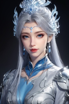 masterpiece,(best quality),official art,extremely detailed cg 8k wallpaper,(extremely delicate and beautiful),solo,realistic,photo_\(medium\),(portrait:1.2),1girl,solo,blue eyes,earrings,mole,white hair,armor,crown,mole under eye,<lora:yudie_v3.1:0.65>,