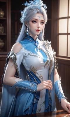 ,masterpiece,(best quality),official art,extremely detailed cg 8k wallpaper,(extremely delicate and beautiful),solo,realistic,photo_\(medium\),chinese clothes,blue dress,1girl,solo,blue eyes,earrings,mole,white hair,armor,crown,mole under eye,<lora:yudie_v3.1:0.6>,