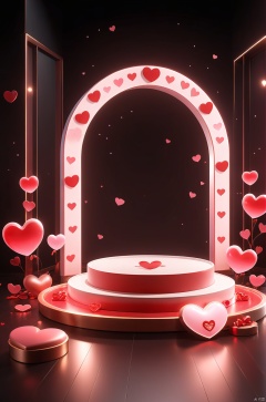 a round podium on the ground in the middle, Valentine's Day theme, glowing hearts, a door shape frame in the background, dark lighting,