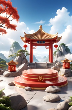 a round podium on the ground in the middle, Chinese aesthetic, Chinese architecture on both sides, rocks, trees, mountains and clouds in the background,