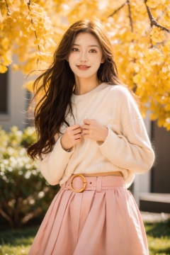 Commercial photography, golden ginkgo tree, 1 girl, waist length black flowing hair, flowing long skirt, big eyes, smile, pink lips, pink cheeks, red lips. Relaxation, depression, powder blusher, shyness, goddess like, playful style dream image, fairy tale core, ultra-high definition image, depth of field, golden ginkgo leaf
