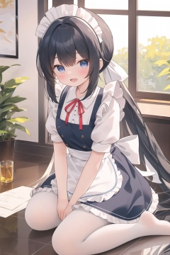 chen_bin,best quality,illustration,ultra detailed,hdr,Depth of field,(colorful),[iumu],[Artist chen bin],1girl, pantyhose, aris (blue archive), long hair, aris (maid) (blue archive), halo, white pantyhose, apron, maid headdress, black hair, maid, very long hair, official alternate costume, blue eyes, short sleeves, solo, looking at viewer, dress, blush, white apron, no shoes, sitting, ponytail, absurdly long hair, frills, black dress, maid apron, frilled apron, wariza, puffy sleeves, puffy short sleeves, soles, open mouth, feet, between legs, white background, hand between legs, ribbon, toes, neck ribbon, peroro (blue archive)