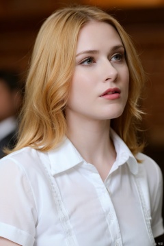 solo, 1girl, blonde hair, realistic, long hair, parted lips, blurry background, shirt, blurry, upper body, white shirt, lips, looking to the side, looking away