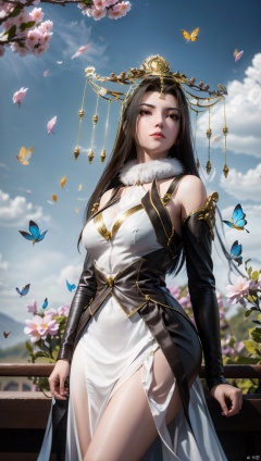 1 girl, dynamic angle, solo, looking at the audience, dress, sky, blue sky, insects, butterflies, branches,,