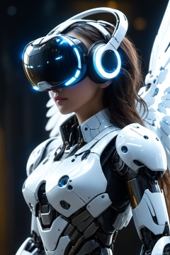 ,bailing_robot,robotics,machine_robo,close-up shot side view of a woman wearing futuristic transparent VR device with glowing lights on the VR device looking upwards,highly detailed,ultra-high resolutions,32K UHD,machine_robo,(cat ears:0.6),weapon,future technologies,Partial texture of a metal robot,solo,weapon,Matte Metal,(wings:0.6),wire,