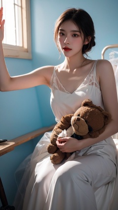 Ultra-realistic 8k CG,masterpiece,best quality,(photorealistic:1.4),HDR,absurdres,Professional,RAW photo,lens flare,(film grain:1.1),Bokeh,((Depth of field)),studio light,a young girl sitting on a chair,a teddy bear in her arms and a flower,1girl,black_hair,dress,flower,lips,looking_at_viewer,photo_medium,short_hair,sleeveless,solo,white_dress,Highly detailed,Professional,extreme detail description;,rock climbing,(adventure:1.1),(challenge:1.2),strength,(vertical ascent:1.3),determination,