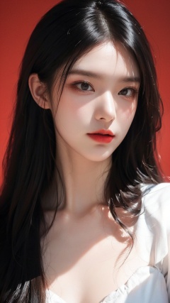 a 20 yo woman,long hair,dark theme,soothing tones,muted colors,high contrast,(natural skin texture, hyperrealism, soft light, sharp),red background,dark,
