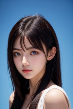 <lora:AgainEyes:0.5>,1girl,black hair,portrait,white dress,purple eyes,shining eyes,blue simple background,