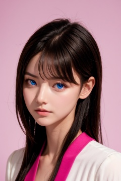 <lora:AgainEyes:1.5>,1girl,black hair,portrait,white dress,blue eyes,shining eyes,(pink simple background:1.25),