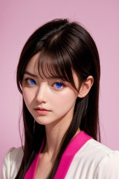 <lora:AgainEyes:1.75>,1girl,black hair,portrait,white dress,blue eyes,shining eyes,(pink simple background:1.25),