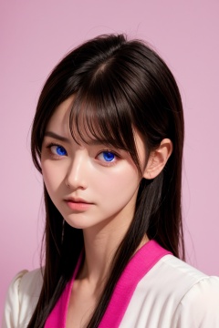 <lora:AgainEyes:2>,1girl,black hair,portrait,white dress,blue eyes,shining eyes,(pink simple background:1.25),