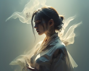 Double Exposure Style,Volumetric Lighting,a girl with Wrap top,arching her back,Traditional Attire,Artistic Calligraphy and Ink,light depth,dramatic atmospheric lighting,Volumetric Lighting,double image ghost effect,image combination,double exposure style,