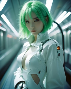 analog film photo futuristic female figure with bright green hair, avant-garde white outfit with mechanical accents, robotic pet companion, cybernetic fashion, vivid contrast, subway platform environment, high-speed train blurring in the background, edgy and modern aesthetic, sci-fi inspired, vibrant persona, best quality, ultra highres, original, extremely detailed, perfect lighting . faded film, desaturated, 35mm photo, grainy, vignette, vintage, Kodachrome, Lomography, stained, highly detailed, found footage