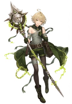 (best quality), ((masterpiece)), (highres), illustration, original, extremely detailed,   <lora:死の爱丽丝:0.7>1boy, male focus, solo, full body, green eyes, polearm, looking at viewer, boots, belt, spear, weapon, gloves, white background, chain, bandages, shorts, tongue, smile, tongue out, staff, pantyhose, blonde hair, holding polearm, holding, simple background, ahoge