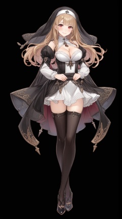 (best quality), ((masterpiece)), (highres), illustration, original, extremely detailed,   <lora:死の爱丽丝:0.7>1girl, solo, breasts, red eyes, blonde hair, long hair, pantyhose, white background, own hands together, full body, large breasts, pelvic curtain, simple background, looking at viewer, black footwear, dress, twintails, veil, bangs, white dress, own hands clasped, cleavage, long sleeves, nun, thigh strap, black pantyhose, closed mouth, detached sleeves, blush, standing, high heels, smile, puffy sleeves, very long hair, cape, no background