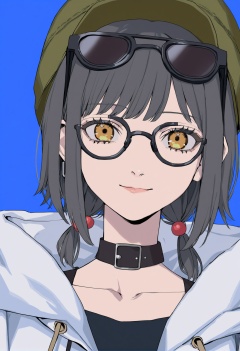 masterpiece, best quality,1girl,   hood, yellow eyes, solo, hood up, black hair, choker, looking at viewer, hooded jacket, blue background, collarbone, jacket, simple background, white jacket, short hair, closed mouth, bangs, hair between eyes, portrait, black choker, hoodie, lips, green headwear, hair bobbles, drawstring, earphones, bob cut, low ponytail, ponytail, eyelashes, realistic, smile, low-tied sidelocks, portrait \(object\), straight-on, single earphone removed, black-framed eyewear, nose, hime cut, swept bangs, eyewear on head, green hair, hat, glasses, hair ornament <lora:hakuhiruoeoeXLlokr-000056:1>