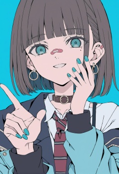 masterpiece, best quality,1girl, solo, bandaid, jewelry, bandaid on face, bandaid on hand, shirt, necktie, earrings, bandaid on nose, jacket, short hair, nail polish, simple background, upper body, parted lips, ring, mole under eye, looking at viewer, bangs, collared shirt, white shirt, mole, aqua nails, aqua background, striped necktie, long sleeves, collar, fingernails, brown hair, striped, choker, aqua jacket, aqua eyes, blue eyes, black hair, multicolored hair, flat color, aqua theme, red necktie, ear piercing, v, piercing, blazer, smile, white nails, hand up, off shoulder, necklace, long fingernails, w, straight-on, blue background, lips, blunt bangs, closed mouth <lora:hakuhiruoeoeXLlokr-000056:1>